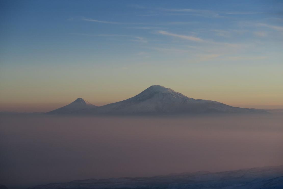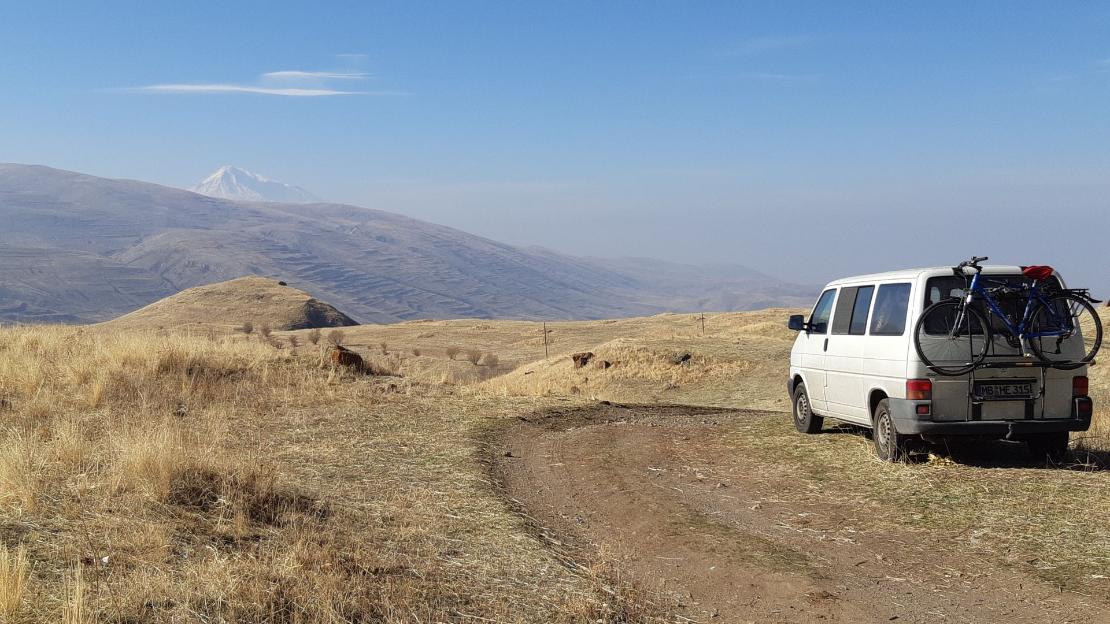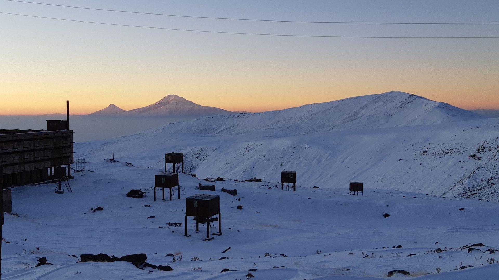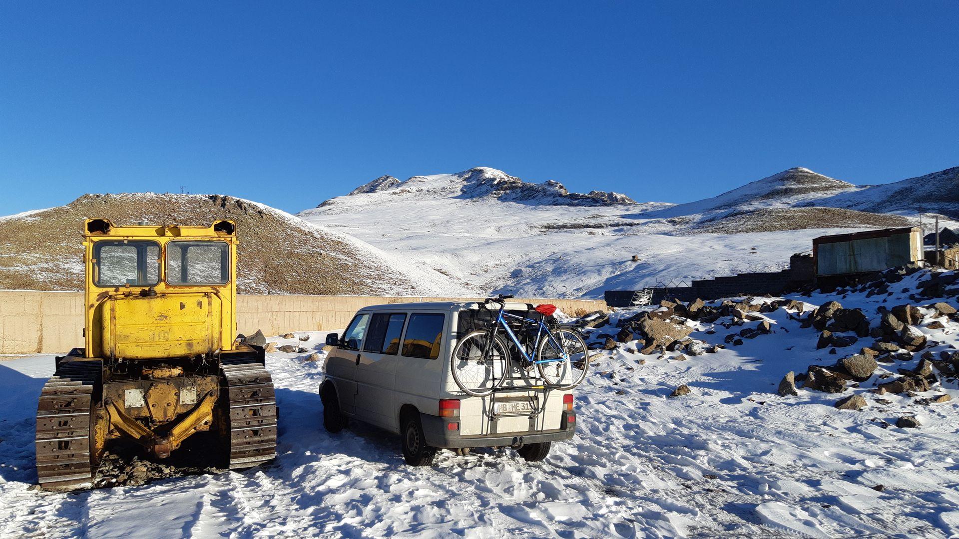 Der Aragatz ist ein erloschener Vulkan, dessen Kraterrand aus vier Gipfeln zwischen 4090 und 3879 m besteht. Der Weg dort hin ist relativ einfach, da eine Straße zu einer ehemaligen Forschungsstation auf 3000 m führt. Da in den Bergen schon Schnee liegt, habe ich die Hoffnung, daß ich dort meine erste Skitour machen kann. Ich fahre am Abend bis zur Forschungsstation, oben weht ein bitterkalter Wind. Doch dank Standheizung brauche ich in der Nacht nicht frieren. Als die Sonne aufgeht, staune ich nicht schlecht. Neben mir ein riesen Bulldozer für den Straßenräumdienst, einige verlassene Häuser und eine Art Hotel mit bewohnbaren Blechschachtel auf Stelzen rundherum, vor mir ein zugefrorener See und der Gipfel.